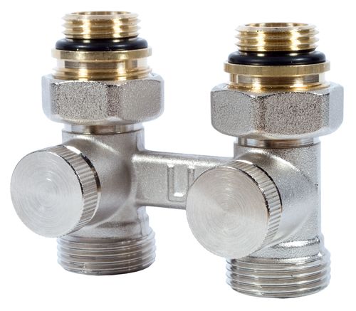 Uzavíratelné šroubení „H“ 1/2“x3/4“ rohové s kónickým těsněním pro VK radiátory, vřetena včetně 2ks adaptérů A12